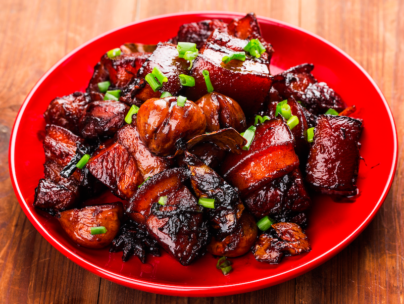 Servir chaud, garni d’oignons verts, avec du riz vapeur.